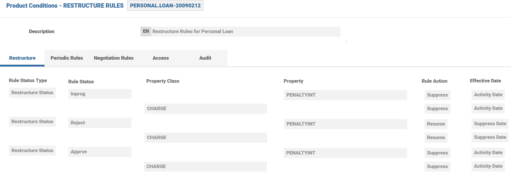 The Restructure Rules Property Class allows the customer or bank to restructure an existing loan. When a customer is unable to repay his loans, either the debt management advisor or the bank is allowed to approach the court to restructure the outstanding debt. The actual restructuring happens based on the court’s order.