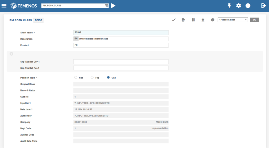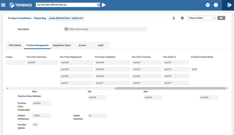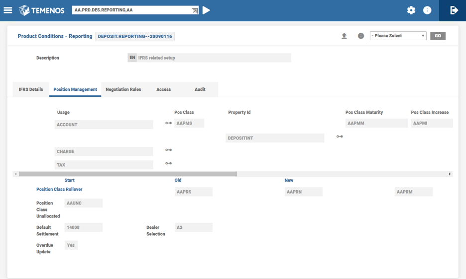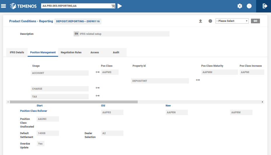 Position classes are the most basic definition for types of events or activities relevant in the management of position risk. For example, a single position class can define principal movements at the beginning of loans and deposits. The Position Management application assigns all business activities recorded in Temenos Transact to a position class. This identifier is then used when building the customised position management reports and enquiries to allocate the activity to its correct position.