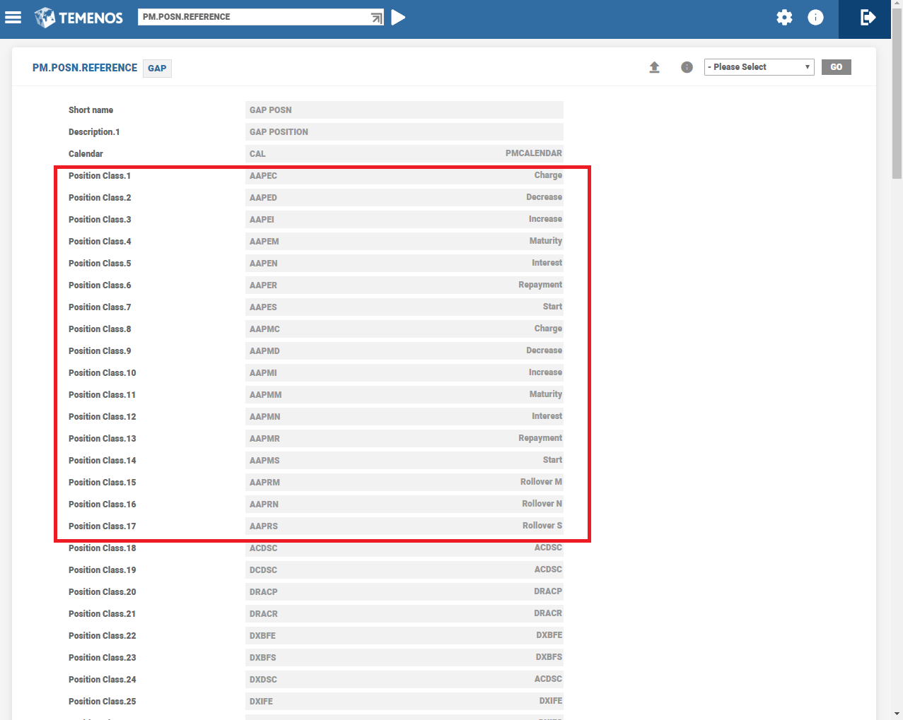 The following table has the sample Position classes for AA to PM. The user can define the GAP and CAS Position classes relating to UNC, overdue, tax and FXP position class.