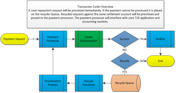 The Transaction Recycler provides the ability to retry failed financial transactions again at regular intervals. This is a generic retry mechanism which can be consumed by any Temenos Transact application. The Transaction Recycler is available for Arrangement Architecture (AA) and Interest and Charged (IC) modules (R13 release and above). Read Transaction Cycler section under Settlement Property Class for more information related to Arrangement Architecture.