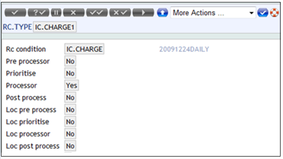 RC.TYPE record is created for IC.CHARGE application and is linked to the RC.CONDITION DAILY. The following fields (in RC.TYPE) are used to determine whether a core routine or a local routine is required to do the processing: