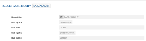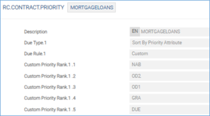 The RC.CONTRACT.PRIORITY application allows the user to define sorting priority criteria based on custom values. For example, based on bills status issued by AA in case of loans repayments. To perform this, the Due Type field must be set to ’Sort By Priority Attribute’ value, Due Rule field must be set to Custom and the multi-valued Custom Priority Rank field must contain custom values in the order which they must be sorted. The Custom Priority Rank field must contain valid EB.LOOKUP record values.