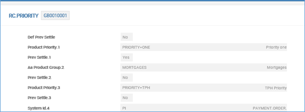 The RC.PRIORITY application is a highest level prioritisation parameter that allows to setup priority of transactions at the company level by EB.SYSTEM.ID or AA.PRODUCT.GROUP. This application is used in conjunction with RC.PRODUCT.PRIORITY and RC.CONTRACT.PRIORITY to create the rules regarding which type of transaction takes priority when there is more than one outstanding transaction against a settlement account. It ranks by EB.SYSTEM.ID, by AA.PRODUCT.GROUP or by a custom RC.PRODUCT.PRIORITY record and the ID to this application can be either a master or a lead company.