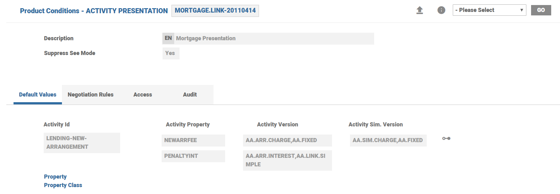 Consider MORTGAGE.PARENT has the Activity Presentation Property linked to a LENDING Product Condition. The child product of MORTGAGE.PARENT is MORTGAGE.LINK. In this child product, same property is attached to MORTGAGE.LINK Product Condition.