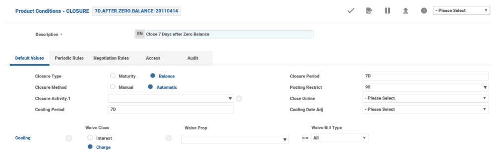 When a loan is pre closed (early matured) within the Cooling Period defined for the product, its interest and charges can be waived. This cooling period can be defined as the number of calendar days in the Closure and Term Amount Property Classes. These features are mutually exclusive.