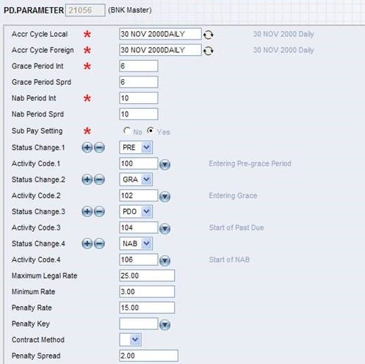 - The PD.PARAMETER contains the time settings that determine when a payment moves from PRE to GRA, from GRA to PDO and from PDO to NAB, and may be defined as a number of days or as a number of payments. In case the change of status from PDO to NAB is not to be automated and controlled only manually, NO may be input in Nab Period Int and Nab Period Spread.
