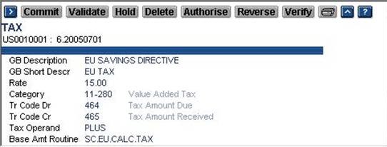 The TAX.TYPE record for the EU Savings Directive is set-up as follows: