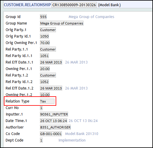 The system splits the EU taxes in the ratio of holdings specified in the CUSTOMER.RELATIONSHIP application. An example screenshot of Customer Relationship Id linked to the SEC.ACC.MASTER application is illustrated below. This determines the joint holders of a portfolio and the percentage of holding.