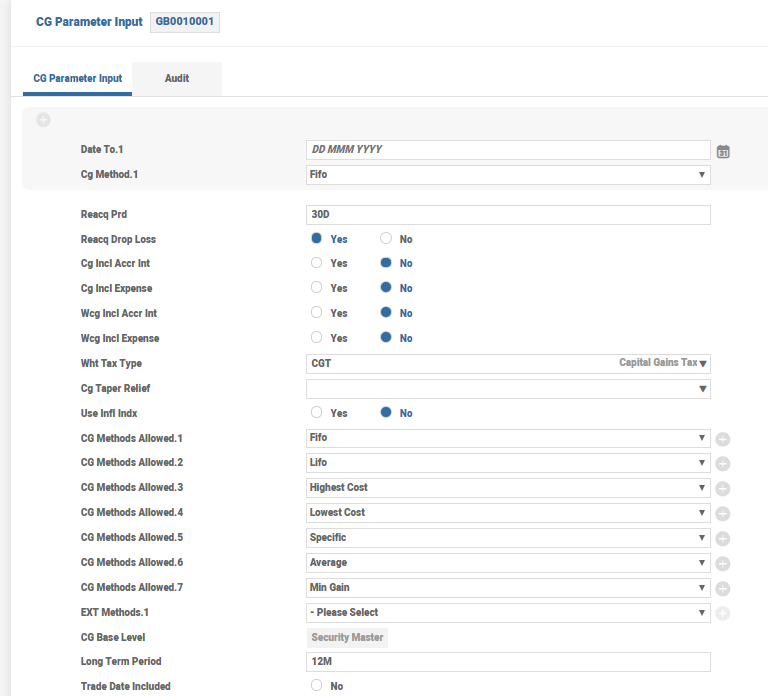 The above settings indicate that the CG method to be used when calculating a gain is First in, First out (FIFO). The tax to be charged CGT is defined in the TAX.TYPE application. When the gain is calculated, the inclusion or exclusion of accrued interest and expenses in the cost is determined by setting the Cg Incl Accr Int, Cg Incl Accr Expense, Wcg Incl Accr Int and Wcg Incl Accr Expense fields. The setting of these parameters can also be specified at ASSET.TYPE or SECURITY.MASTER level, where the SECURITY.MASTER takes the high priority than the CG.PARAMETER.