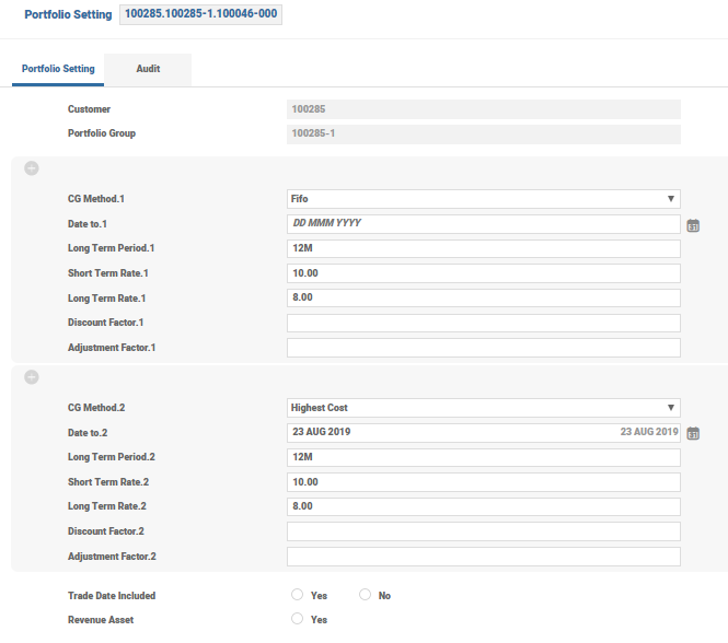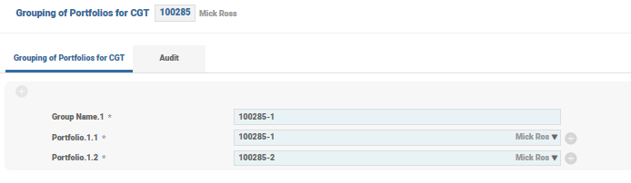 This application supports the grouping of multiple portfolios into a group. The ID of the record is a valid customer ID. Only portfolios of the same customer can be grouped for CG calculation.