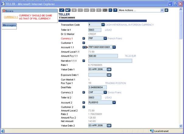 The TELLER module in Temenos Transact processes a variety of retail transactions. It is an account based application for moving funds. It incorporates the administration of tills, processing of local and foreign currency transactions, travelers’ cheques, currency transfers, denomination control, passbook updates, advice production, automatic charges defaulting, and rate defaulting.