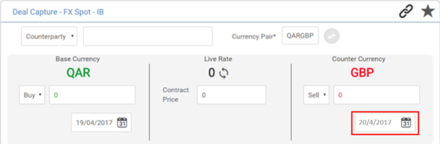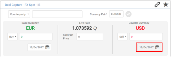 If one of the currencies in the pair is configured as a Split Value Currency, the user is allowed to input value date on the counter currency-side as shown below: