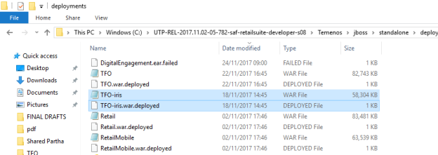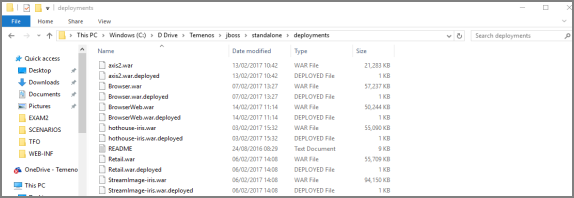 TFO.IRIS.War, go to the existing deployment folder (Temenos>JBoss>Standalone>Deployments). - Delete the previous