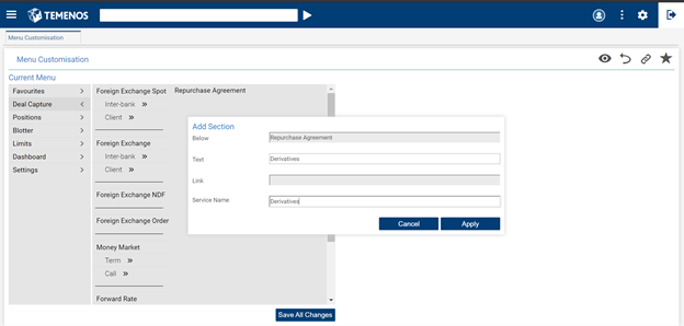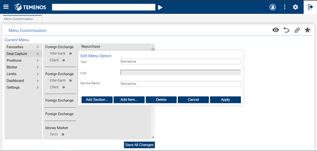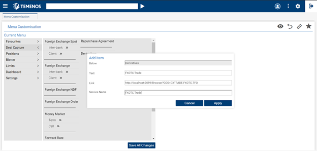 - Select the menu item (for example, Deal Capture) in which a sub-menu needs to be added.
