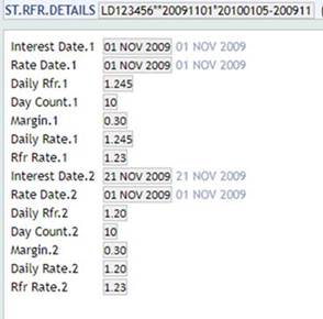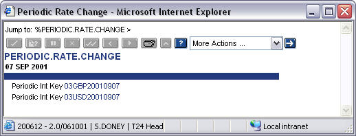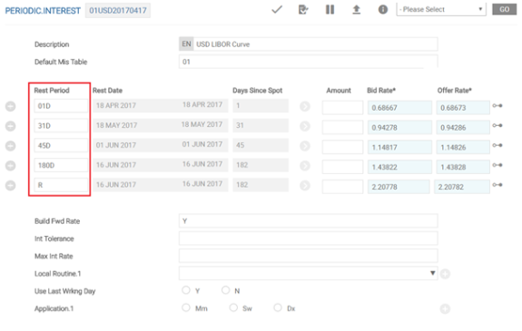 The PERIODIC.INTEREST application defines, for each currency, interest rates for any time period desired by the user for example, 10 days, 15 days, and 30 days. For each period defined by the user, both a bid and offer rate can be entered. Interest rates can also be defined by amount slabs, so a different rate can be entered for ranges from USD1 to 10,000 and between USD10,000 to 25,000.