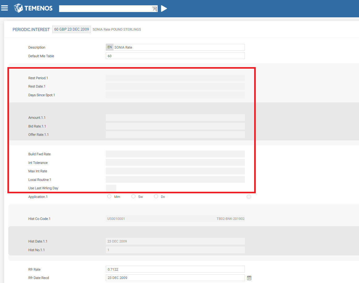 It is possible to modify the Rest Period fields, Amt, Bid Rate and Offer Rate field of existing PERIODIC.INTEREST records of a past date. The use of such modified records is application dependent. Whenever a PERIODIC.INTEREST record of a past date or processing date is modified and authorised, the ID of such records are written in the PERIODIC.RATE.CHANGE application. The ID of this application is the processing date.
