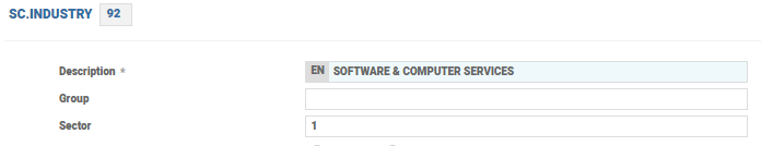 The industry codes defined in this application are assigned to each record in SECURITY.MASTER to identify the industry to which the security belongs too. The Industry Code and Sc Ind Internal fields in the SECURITY.MASTER application are used to capture the industry code from the SC.INDUSTRY application. The below screenshot is the record in SC.INDUSTRY for the above SECURITY.MASTER.