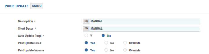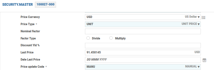 The current price of a security can either be updated manually or automatically (through Bloomberg, Reuters, Telerate feeds and so on). This can be specified in Price update Code field of the SECURITY.MASTER application. This field gives the list of the possible options. If the user selects the manual input, the user can change the price in Last Price field, therefore the system date automatically defaulted into the Date Last Price field. The Price Type field defines the calculation method that is used when calculating the price of a trade.