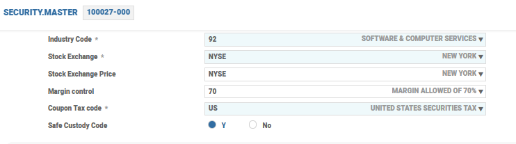 The Company Domicile field refers to the country of the parent company issuing the security. The Security Domicile specifies the country where the security is issued. The Security Ccy indicates the place where the security is issued and the Price Currency field indicates the currency in which the security is traded. This field accepts a valid record from the CURRENCY application. The below screenshot is an example of a record in SECURITY.MASTER.