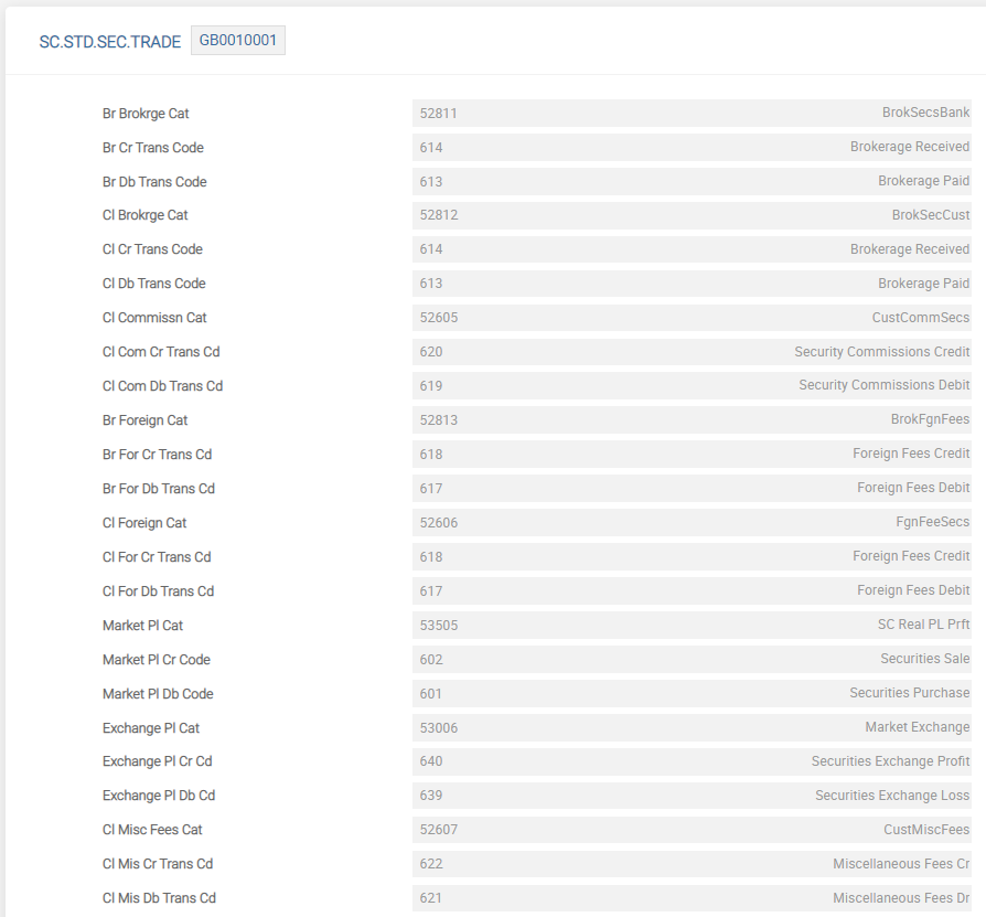 SC.STD.SEC.TRADE - This application contains company-level default values, which is used when processing spot purchases and sales transactions. These defaults are applicable irrespective of the transaction type and the user has to create one record for each company on the system.
