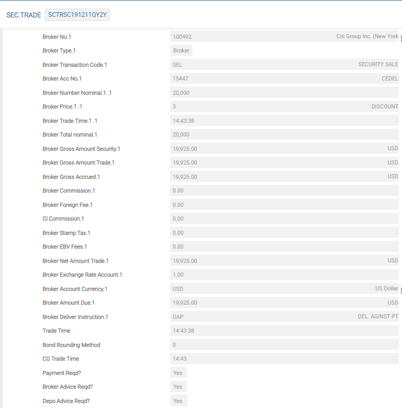 | Broker Total Nominal, Broker Gross Amount Security and Broker Gross Amount Trade | Displays the total amount of the security arranged with the broker, the gross value of the security in security currency and the gross amount in the trade currency whether or not the transaction is for settlement in a different currency or not. The values in these fields are calculated based on the sum of the Broker Number Nominal multi-value fields for each broker. |