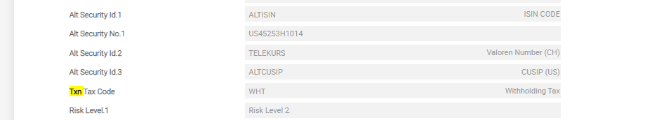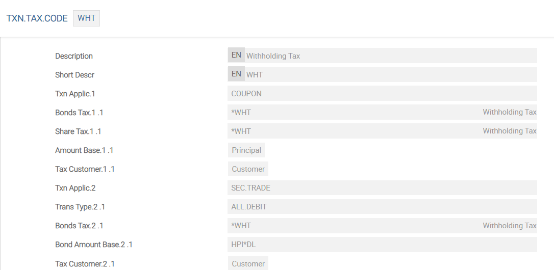 The Redem Price field in the SECURITY.MASTER application is populated with a value to calculate the discounted amount per sale transaction. In this case, the redemption price is 100. The TXN.TAX.CODE should then be attached to the SECURITY.MASTER application. The withholding tax (WHT) can only be calculated when a security is redeemed or sold. The record in SECURITY.MASTER displays the setup for consideration rounding and withholding tax on sales.