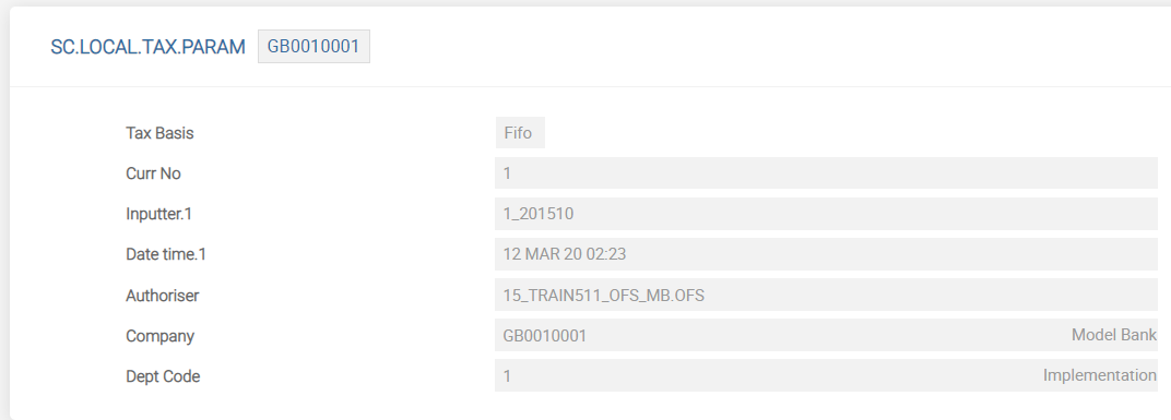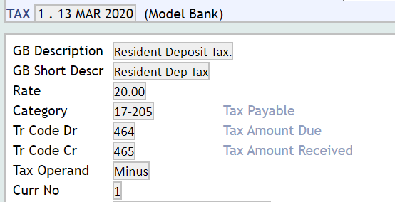 A record needs to be created for each tax. The ID of this application is a numeric ID followed by the date. If there is a change in the rate, a new record for the same ID with the new effective date needs to be created. The rate of tax and the internal account category to which the tax is to be posted is defined in this application.