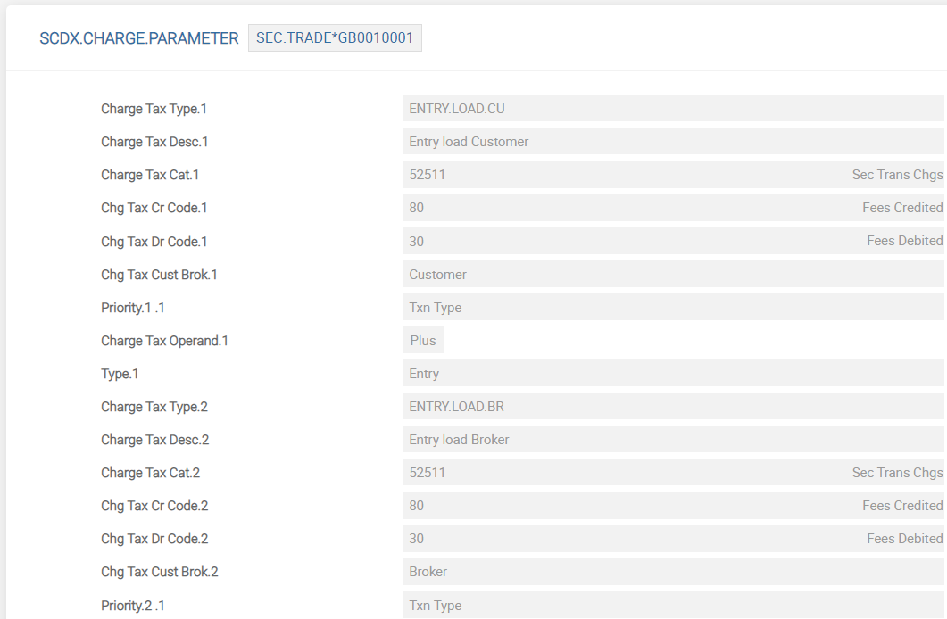 The ID of SCDX.CHARGE.PARAMETER application is Application*Company Code. If the parameter setup is done for an application (such as SEC.TRADE), the charge type is defaulted in the respective application on the customer side or broker side, which is defined in Chg Tax Cust Brok field. The Charge Tax Type field can be multi-valued to define multiple charges and taxes. This is a free format text field. However, each multi-value should have a unique name.