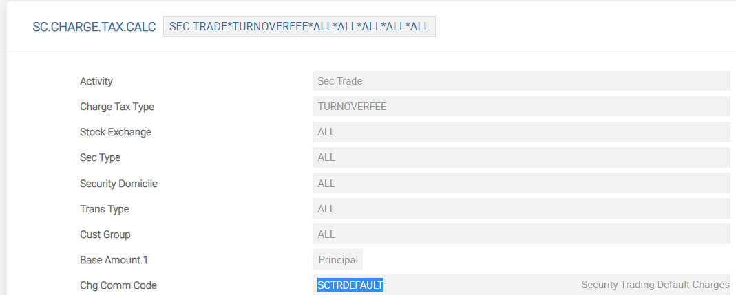 The criteria for charging these fees and taxes should be defined in SC.CHARGE.TAX.CALC application once the parameter setup is done in SCDX.CHARGE.PARAMETER. The ID of the application is Application*Fee*Stock Exchange*Security Type*Security Domicile*Transaction Type*Customer Group.