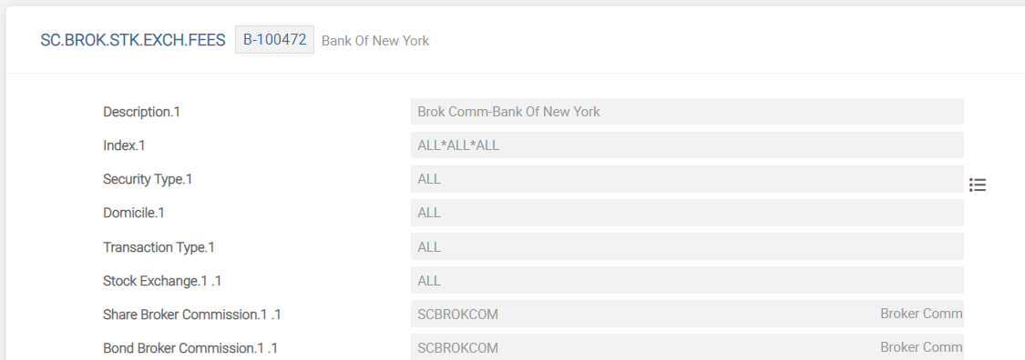 The SC.BROK.STK.EXCH.FEES application is configured if a detailed setup of broker fees or commission is required. This application is used to calculate the broker commission fees based on the combination of values such as broker, type of product, type of transaction, and stock exchange or stock exchange domicile.