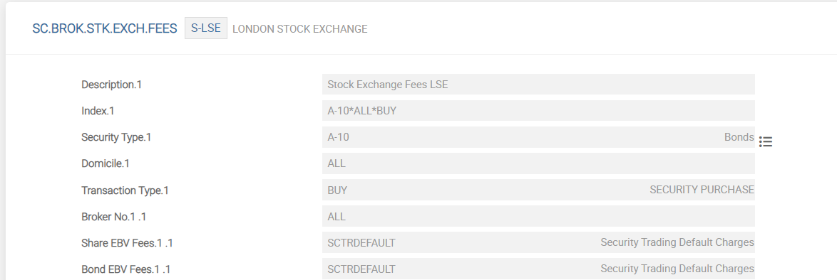 The SC.BROK.STK.EXCH.FEES application is also used to set stock exchange fees based on the combination of values: