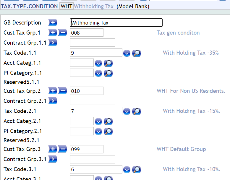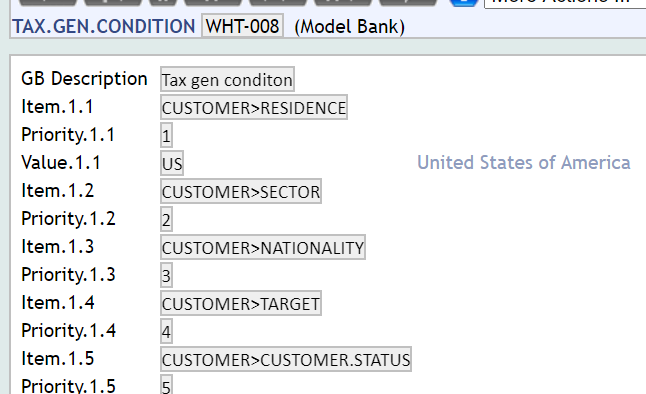 The tax record in condition.priority allows the user to define the fields in CUSTOMER and FATCA.CUSTOMER.SUPPLEMENTARY.INFO applications that can be used to group customers for tax calculation.