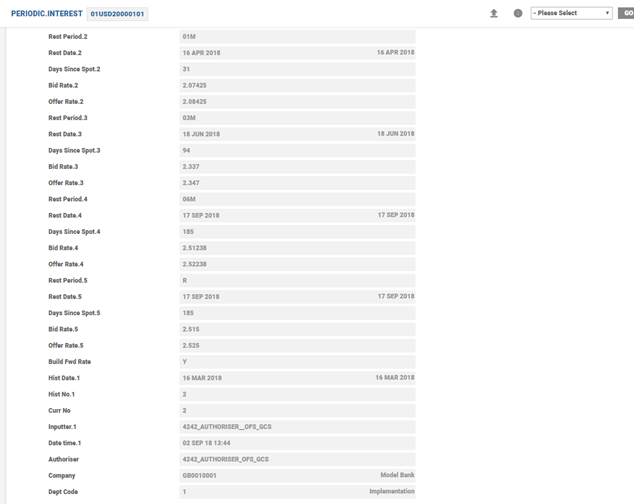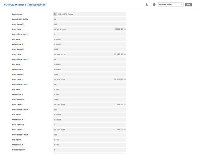 PERIODIC.INTERESTfor each type of floating rate that is required. For example, three month LIBOR and six month LIBOR are setup as two different records withinPERIODIC.INTEREST. For example, 07USDyyyymmdd can represent the three month LIBOR rate and 08USDyyyymmdd can represent the six month LIBOR rate for the same system date. - Each record needs to have one entry other than the Rest entry. If the table has more than these two entries, only the first value (by nearest date) is used; the second and any other subsequent values are ignored. The same reference key is also used in floating rate reset using