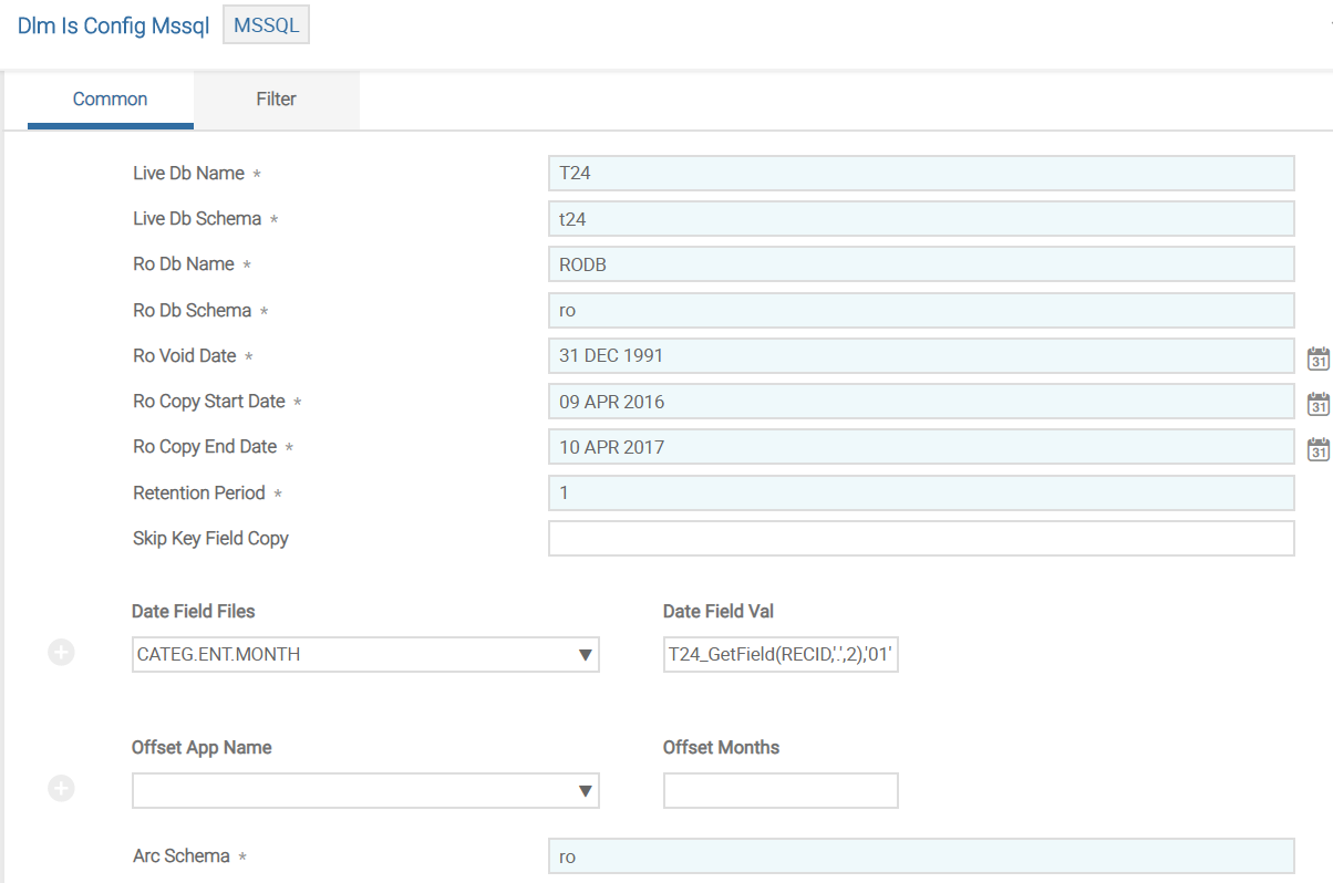 The Purge Date and Retention Period fields are used to specify the records selection for archiving. This is based on a date which can either be specified in Purge Date (must be the first of the month and for CATEG.ENTRY field must be before the last financial year-end) or Retention Period field. The records older than this date are archived or deleted. Purge Date is calculated automatically from the retention period at runtime. For example, if the current date is 23/05/2012 and retention period is specified as three months (03M), records dated before 1/2/2012 are archived or deleted.