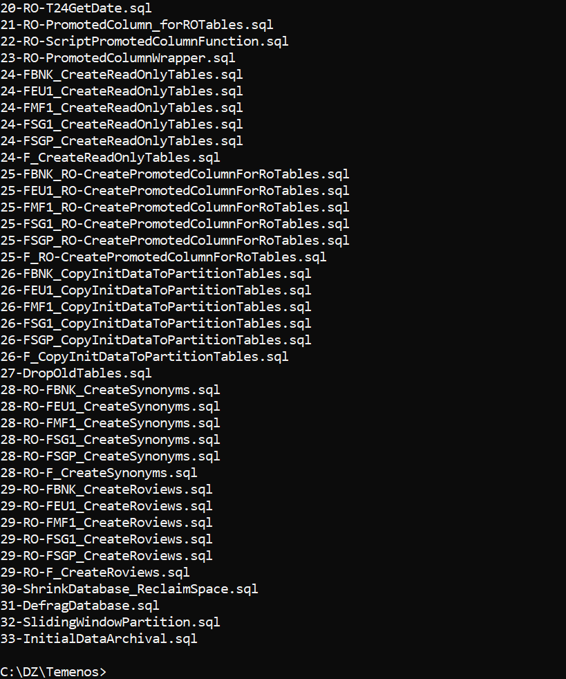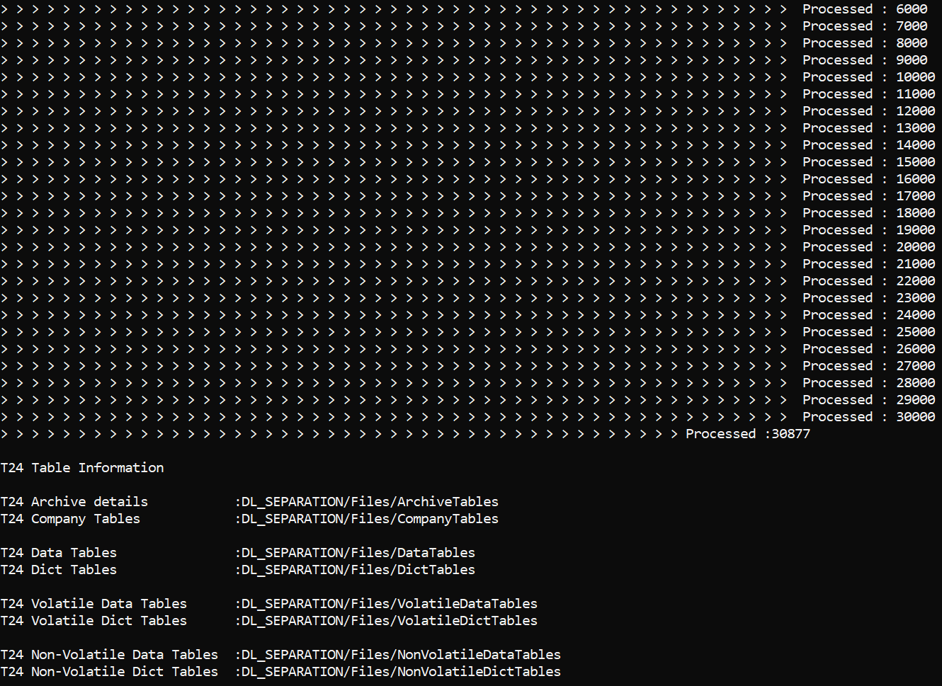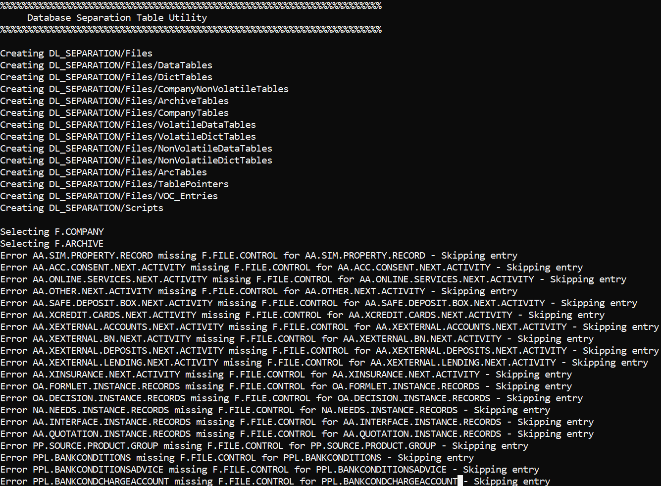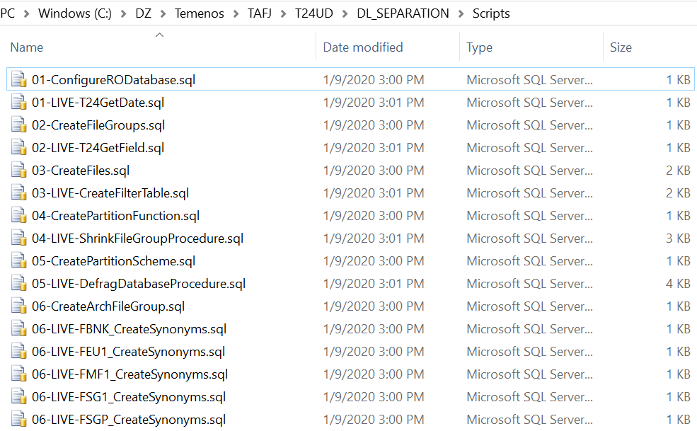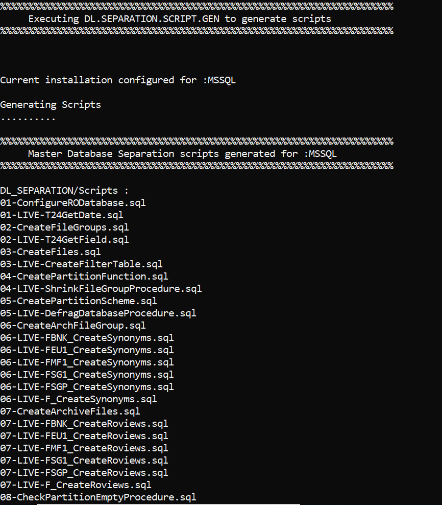 DL.SEPARATION.SCRIPT.GEN.TAFJ or DL.SEPARATION.SCRIPT.GEN.TAFC creates various database scripts that need to be directly run on the configured databases. These scripts configure or create the RO database for storing the non-volatile data.
