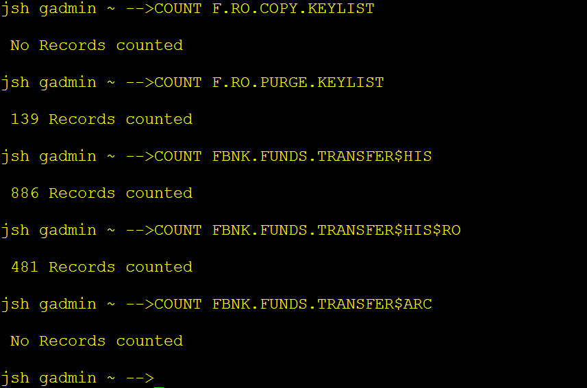 The following example screen captures show that the original record count of the FBNK.FUNDS.TRANSFER table has been reduced from 886 to 481 by moving 405 records to the RO database table FBNK.FUNDS.TRANSFER#HIS#RO, which were in the PURGE.DATE range into the.