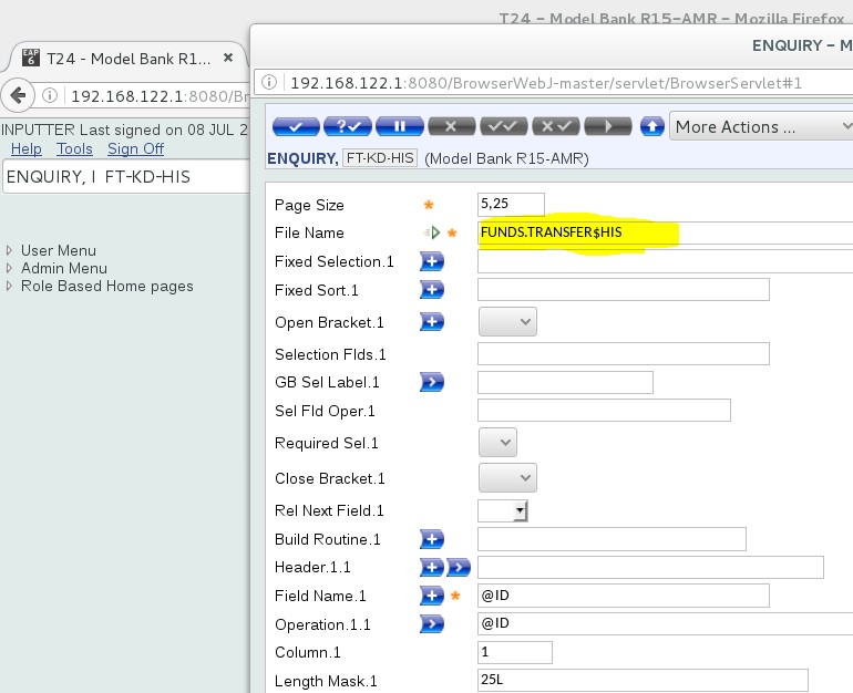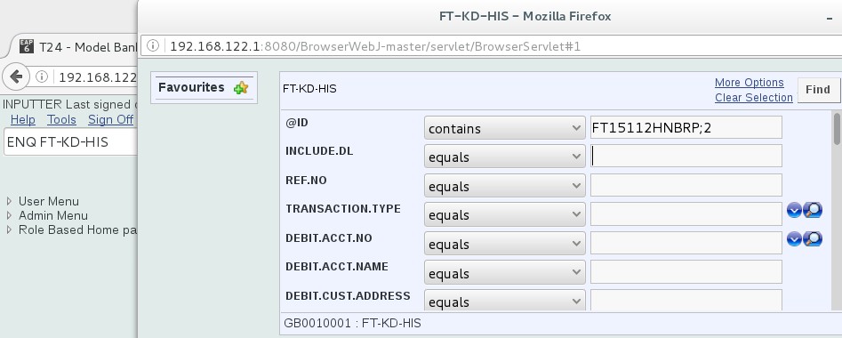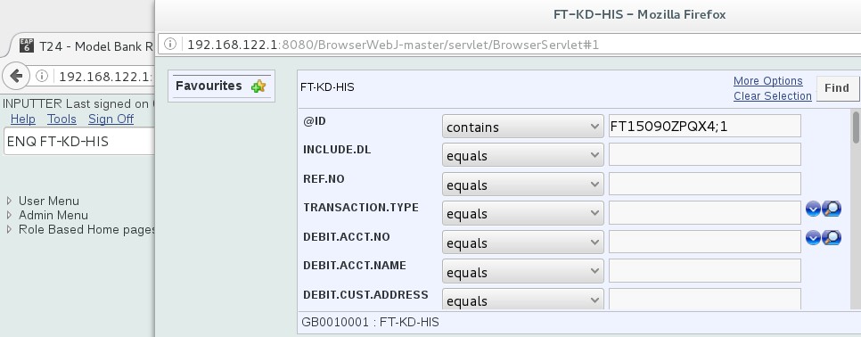 You need to select a RECID from FBNK_FUNDS_TRANSFER#HIS and FBNK_FUNDS_TRANSFER#HIS#RO from the LIVE and RO databases, respectively The following screen captures shows an example Funds Transfer record for the LIVE and RO databases, respectively.