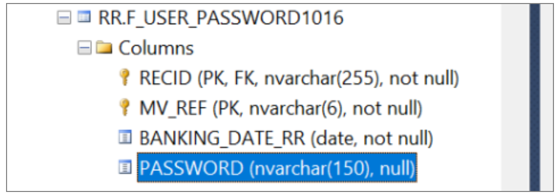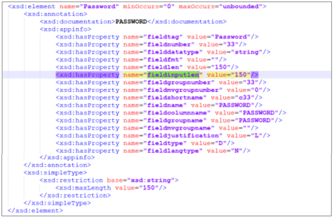 Note that the fieldinputlen value for the PASSWORD field has been updated to 150 automatically. This value comes from the RR.OVERRIDE.PARAMETER table.