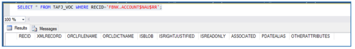 In the TAFJ_VOC table in Temenos Transact, for the application FEU1.ACCOUNT$NAU the VOC record for Relational Replication FEU1.ACCOUNT$NAU$RR is deleted as illustrated below.