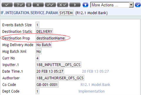 - Deliver each event as a JMS message within a transaction through the DeliveryMDB. The DeliveryMDB is configured to handle messages for an activation string which is equivalent to that of the value in the event XML for the property destinationName which is given in the field Destination Prop.NOTE:
