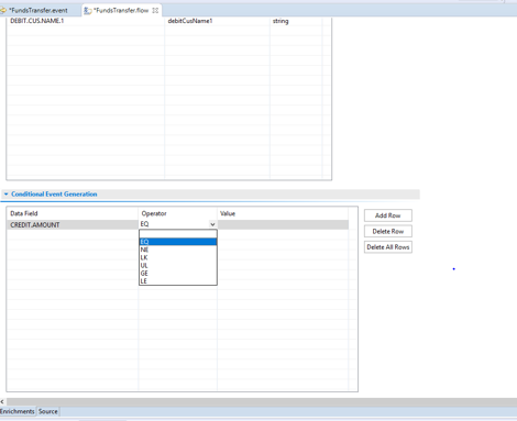 • The Operator column in the Conditional Event Generation table has a drop-down list with the options: EQ, NE, “LK”, “UL”, “GE”, “LE”. Select the operand to define the condition.