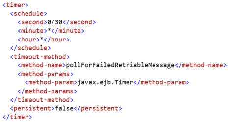 This InflowFailureRecoveryEjbTimer bean has a timer configuration to poll for failed messages. By default, InflowFailureRecoveryEjbTimer retries a message once in 30 seconds: