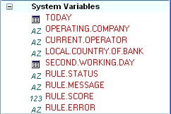 The system variables represents the system state during the rule evaluation and are used when defining a business rule. However, when defining a business rule, you can use only the special system variables. For example, RULE.SCORE.