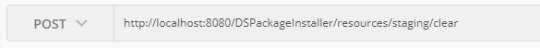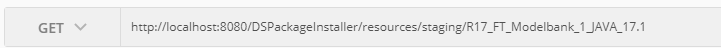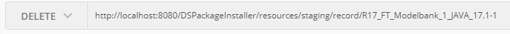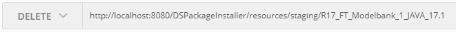 curl --request PUT \ --url http://localhost:8080/DSPackageInstaller/resources/staging \ --header 'authorization: Basic dGFmajp0YWZqITIwMTY=' \ --header 'cache-control: no-cache' \ --header 'content-type: application/x-www-form-urlencoded' \ --header 'postman-token: 6a092c9d-334a-2a27-0a8e-3629b68ee796' \ --data packageName=R17_FT_Modelbank_1_JAVA_17.1