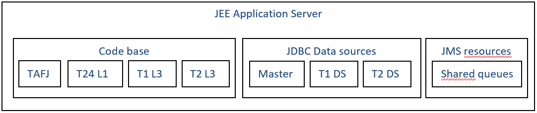 In TAFJ multitenant architecture, all participants or tenants share same application server resources and Temenos Transact or TAFJ code base but use separated databases and configurations. JMS resources are shared and do not differ from a regular deployment.