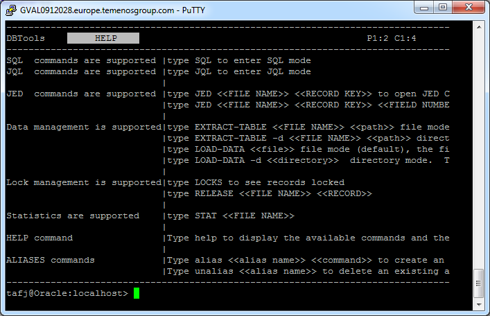 When opening DBTools console, the HELP command is launched by default and the available commands are displayed on the main panel.