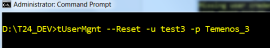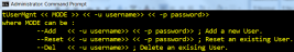 tUserMgnt << MODE >> << -u username>> << -p password>> where MODE can be : --Add << -u username>> << -p password>> ; Add a new User. --Reset << -u username>> << -p password>> ; Reset an existing User. --Del << -u username>> ; Delete an existing User. extract