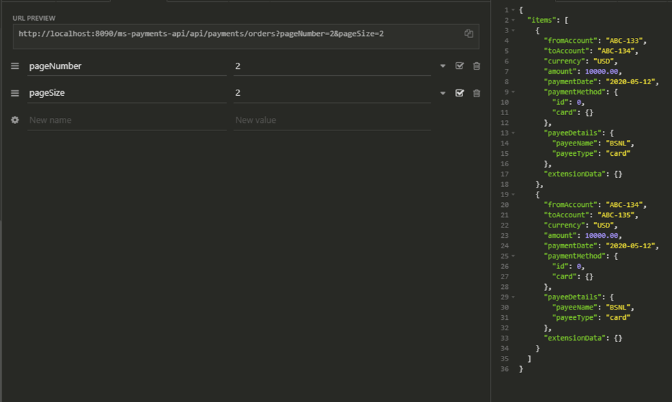 Sample URL is < URL>/?pageNumber=2&pageSize=2.